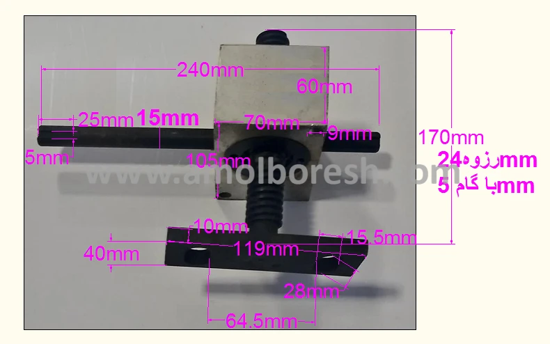 - پیچ:پیچ 24 میلیمتر با گام 5 میلیمتر به طول 170 میلیمتر