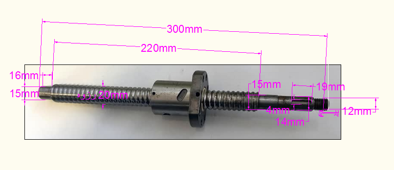 - ابعاد: طولی کلی قطعه 300 میلیمتر طول پیچ بال اسکرو 220 میلیمتر با قطر 20 میلیمتر و گام 5 میلیمتر